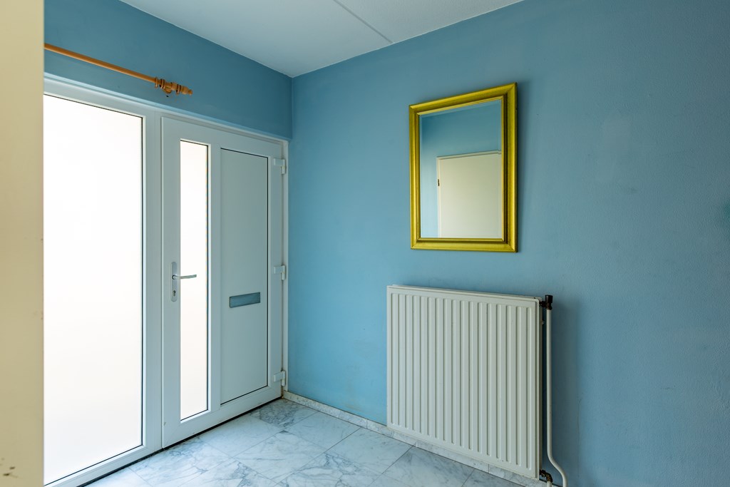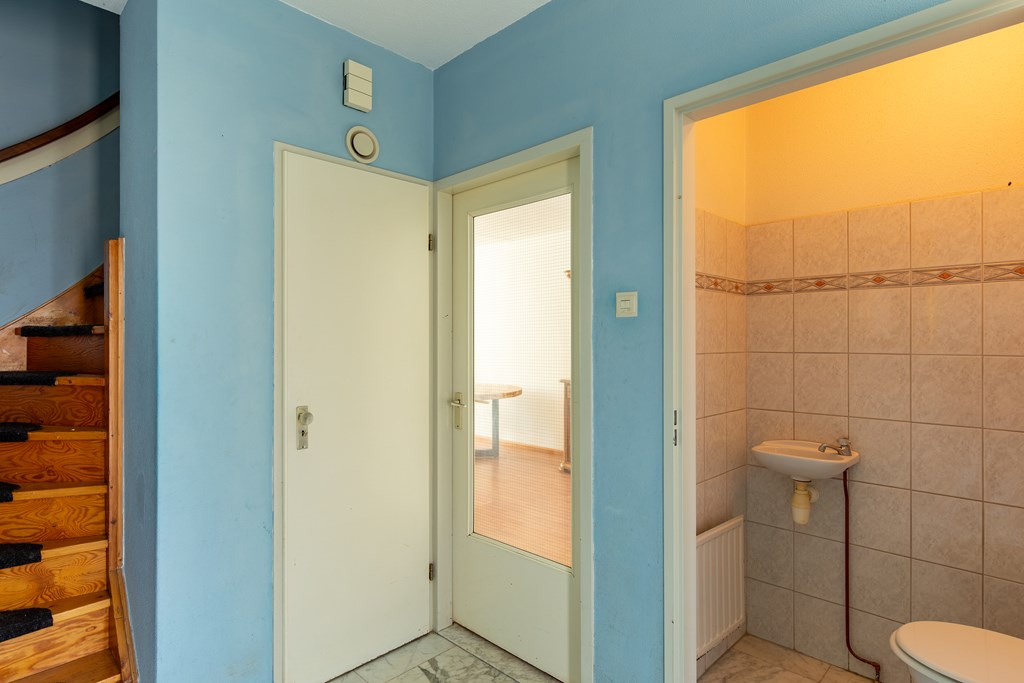 Via de voortuin, die evt. ruimte biedt voor een auto, bereik je de ruime entreehal met meterkast, toiletruimte met fonteintje en trapopgang naar de eerste verdieping.