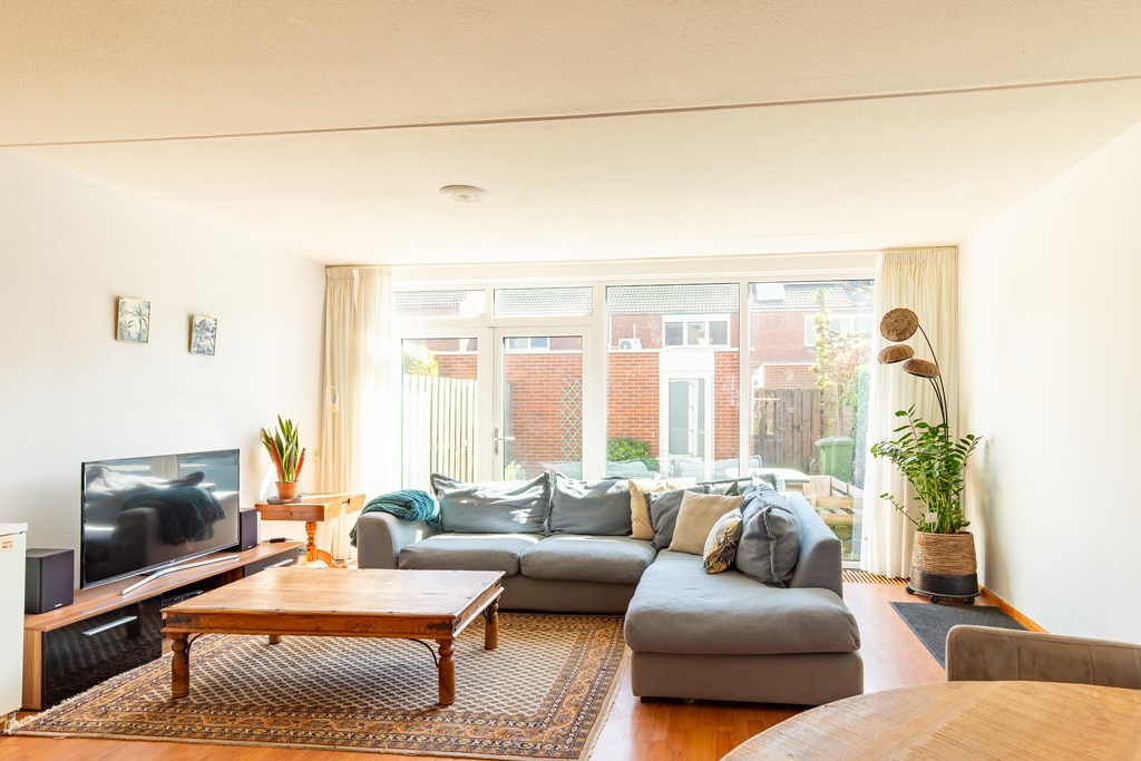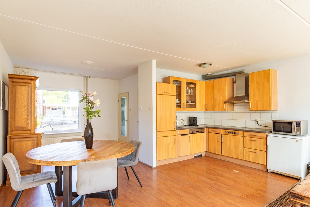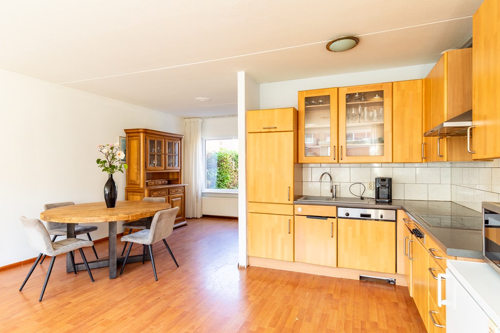 De woonkamer vormt samen met de open keuken een royale leefruimte van ca. 39 m². Door de brede pui aan de tuinzijde stroomt het daglicht rijkelijk naar binnen. De open keuken is gedateerd, maar biedt mogelijkheden om naar eigen smaak te moderniseren of evt. te verplaatsen, via de kruipruimte is leidingwerk eenvoudig verplaatsbaar.