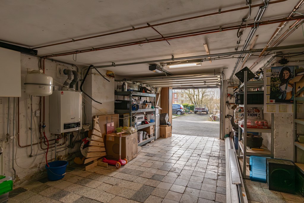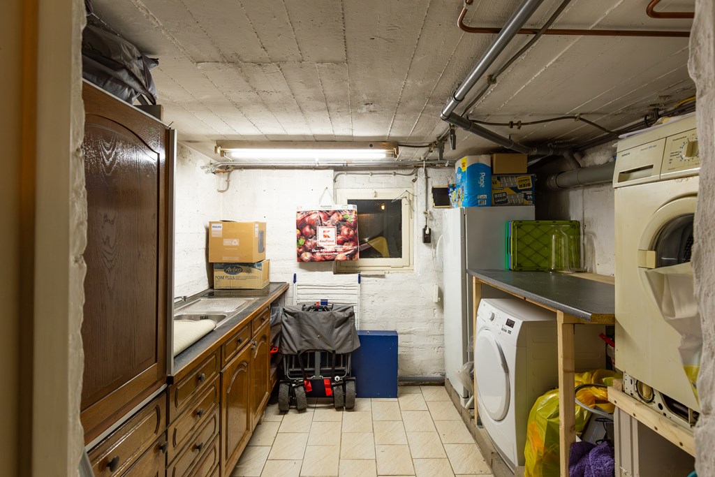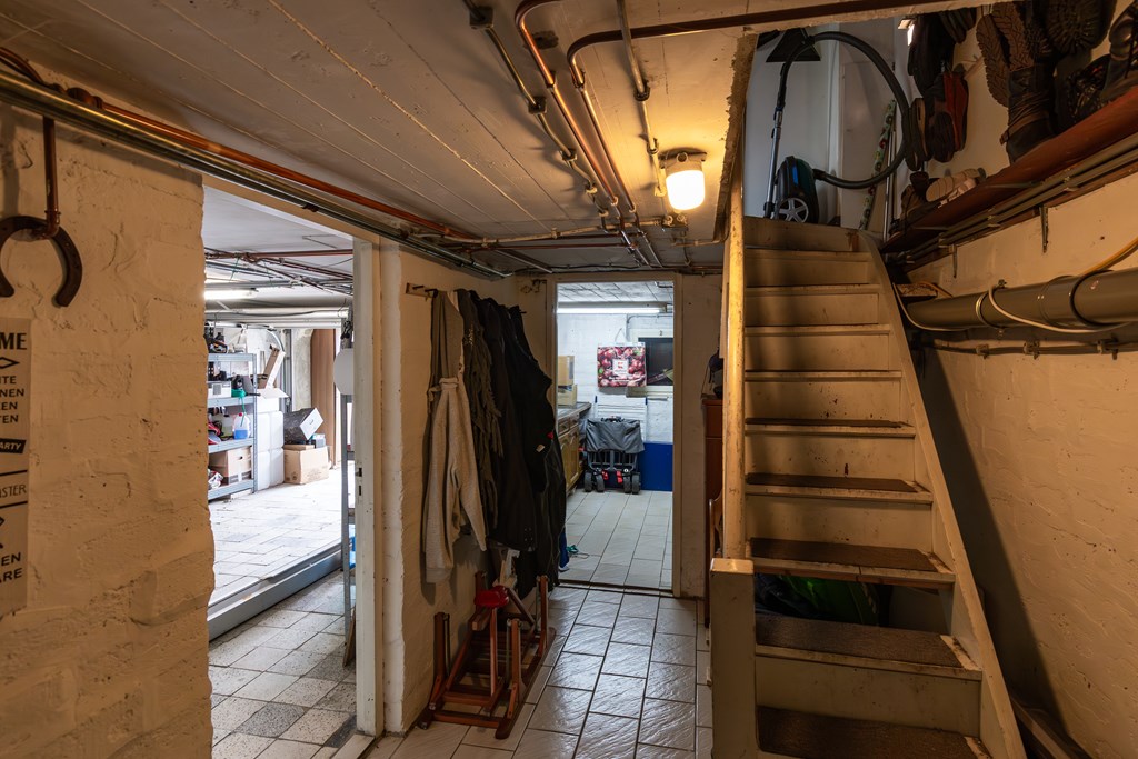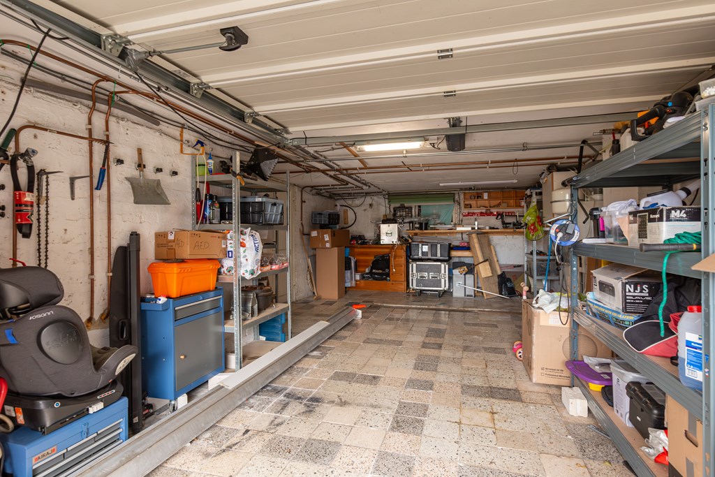 Het huis is volledig onderkelderd. Hier vinden we dan ook enorm veel berg- en opslagruimte. De kelder is opgedeeld in een garage (30,1 m2) met elektrische poort, en de HR cv-installatie (huur), een provisieruimte met toegang tot de begane grond en een wasruimte.
