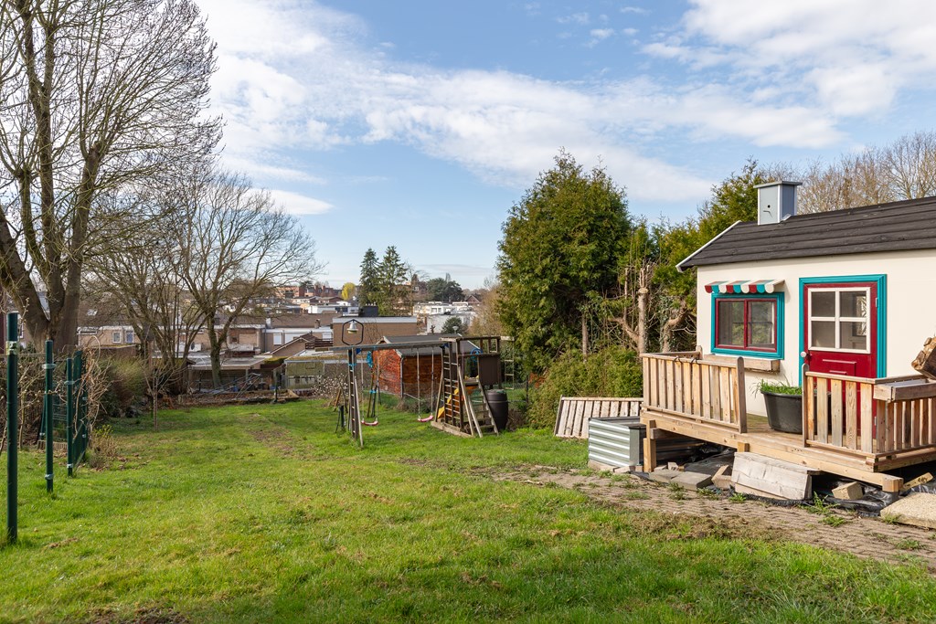 Het huis is voorzien van een voor- en achtertuin. Naast de woning ligt de gedeelde oprit, afsluitbaar met een poort. De achtertuin is ruim van opzet, met een diepte van 55 meter en ligt gedeeltelijk in een helling. De tuin bestaat uit een beklinkerd(e) terras / parkeerplaats en een grasveld met beplanting. Een heerlijke plek voor kinderen om buiten te ontdekken. De tuin ligt lager dan het woonniveau, maar is prima bereikbaar middels een betonnen trap, vanaf het woongedeelte. Het balkon heeft een diepte van ca. 1,50, en is dus een plek waar je lekker kunt zitten.